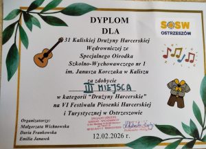 12 lutego 2026 roku reprezentacja naszej szkoły wzięła udział w Festiwalu Piosenki Harcerskiej i Turystycznej w Ostrzeszowie. Było śpiewanie na całe gardło, dobra energia, mnóstwo uśmiechów i prawdziwie harcerski klimat. Nasza dzielna szóstka, czyli Nikola (2a), Kamil (2b), Małgosia (2e), Krzysztof (3b), Adrian (3b) i Paulina wyśpiewali nagrodę piosenką: Gdzie strumyk płynie z wolna… Udział w konkursie pozwala nie tylko na rozwijanie aktywności twórczej i artystycznej dzieci i młodzieży, ale zachęca do wykonywania starych utworów w nowych interpretacjach i aranżacjach. Jest też okazją do propagowania piosenek harcerskich i turystycznych, ale przede wszystkim do nawiązywania relacji w harcerskim gronie.